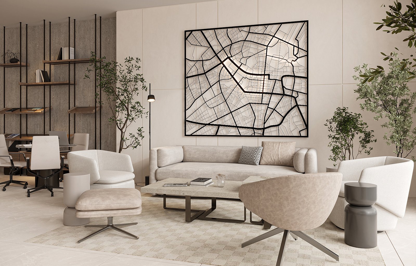 The showroom is designed as a sleek, modern contemporary space that offers an engaging and seamless experience for clients exploring the developer’s projects.