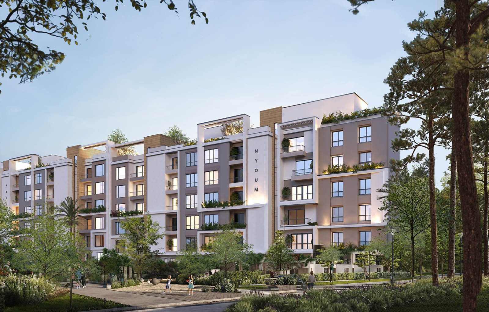 The project includes five residential buildings, two medical buildings, one mixed-use building (commercial, administrative, and residential), and a service apartment building, all organized within a cohesive and efficient urban framework.