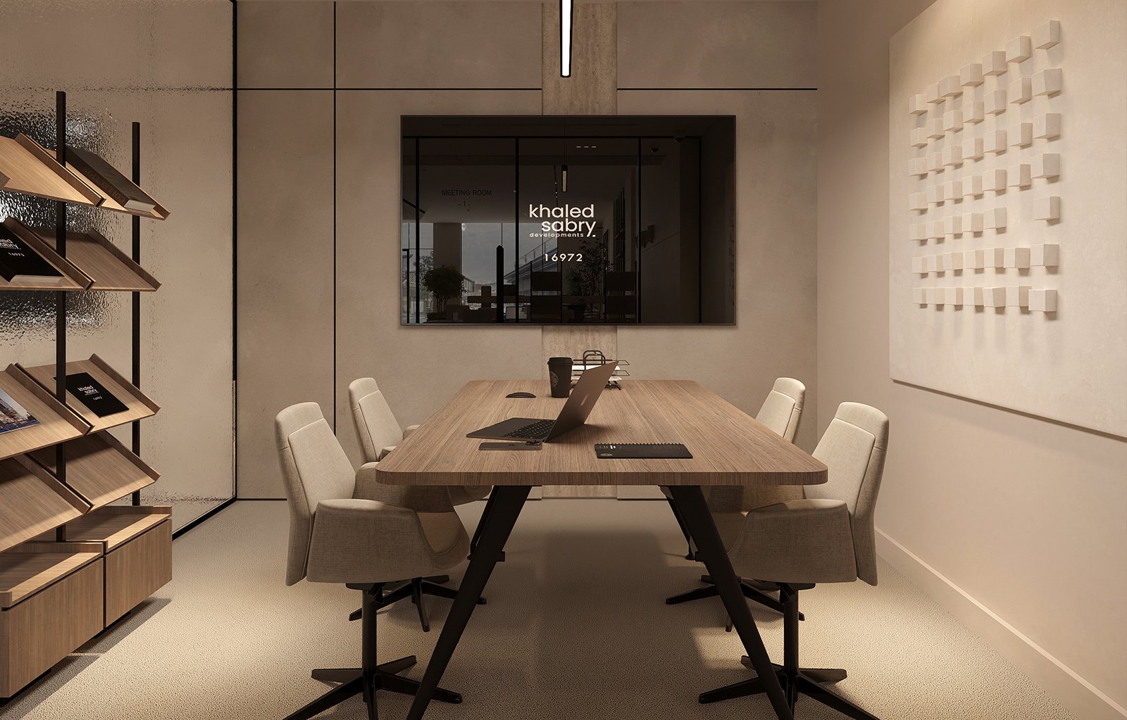 Thoughtful circulation and lighting guide clients effortlessly through the showroom, highlighting key displays while maintaining comfort and clarity. By combining functional layouts with a polished aesthetic, the showroom transforms the sales process into a smooth, inspiring journey, reinforcing trust, sophistication, and the modern vision of Khaled Sabry Developer.