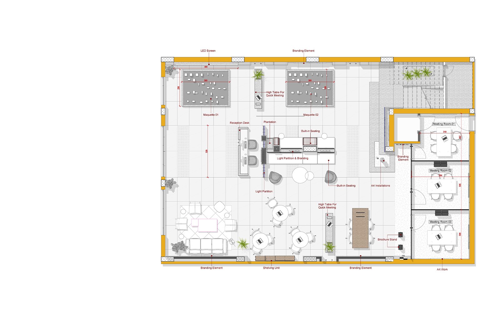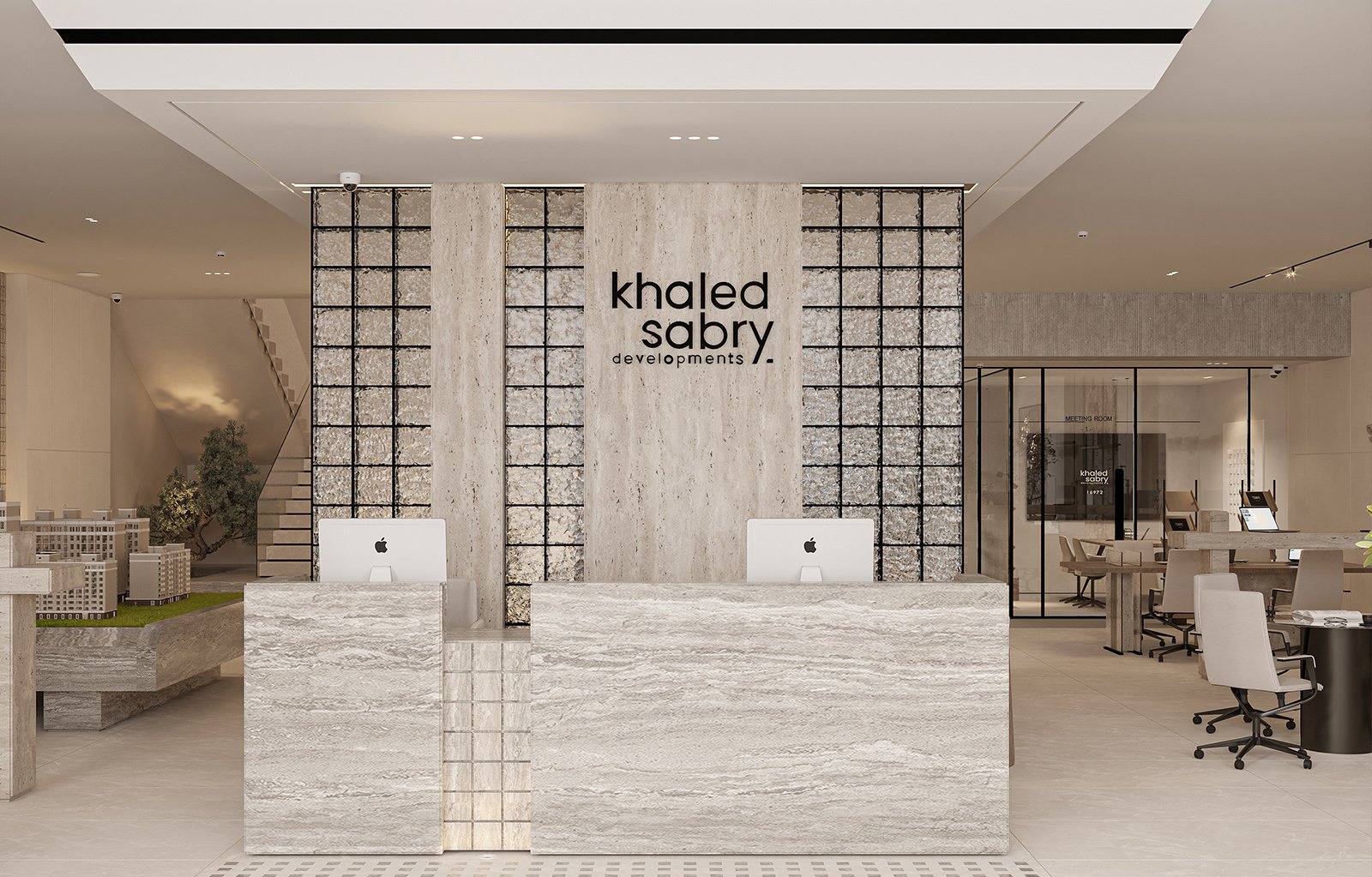 The space features a welcoming reception desk, two detailed project maquettes, multiple seating areas, and private meeting rooms, all carefully arranged to encourage interaction, discussion, and personalized consultations.