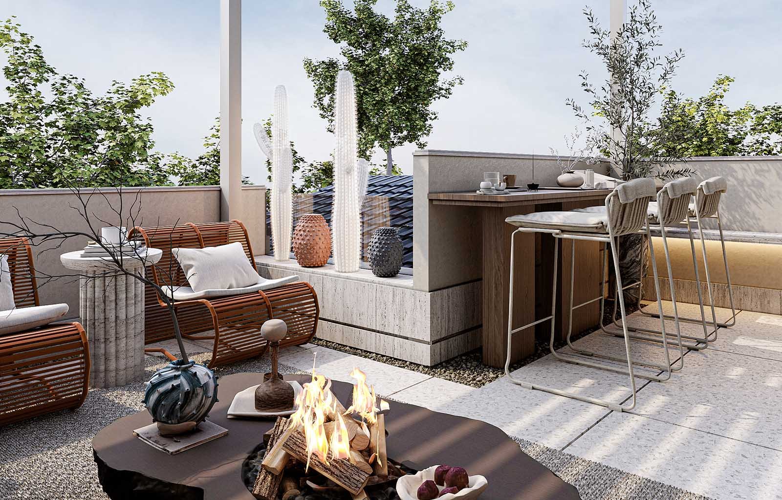 The landscape and rooftop areas are designed to complement the interior vision, creating inviting, functional, and visually cohesive outdoor environments.